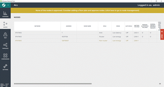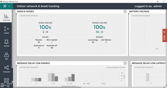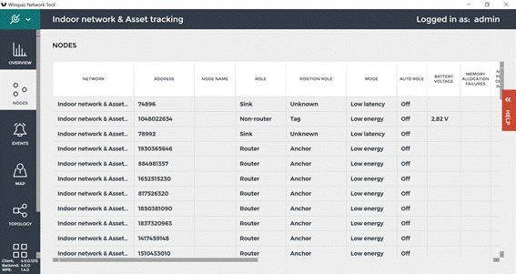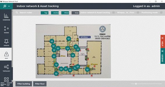The Wirepas Network Tool Client is a Windows 10 tool allowing to visualize the network topology, nodes diagnostics and position. Wirepas Network Tool client can be used also for the installation phase to input floor plans and set the position of anchors on the floor plans.