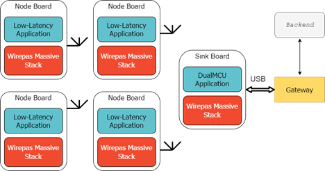 The nodes are connected wirelessly to form a Wirepas Mesh network. Four nodes are needed to properly demonstrate the multicast feature. The sink board is connected through USB to a PC running Wirepas Gateway Services. The Low-latency application will be flashed on the nodes, and the Dual-MCU application on the sink board.