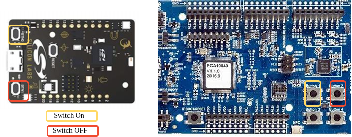 The following diagram shows the location of the buttons on both Nordic and Silicon Labs boards and their associated functionalities :