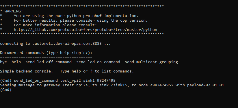 An other switch ON/OFF message can be sent with adaptive flooding downlink from the sink to the nodes, in Unicast (only to one node), Multicast (to some nodes identified by the same group address), or in Broadcast (to all the nodes in the network). This message can be sent using Wirepas MQTT Console or the backend python script contained in the “backend_scripts” folder. Both of the methods will be presented.